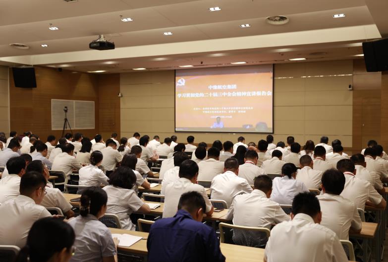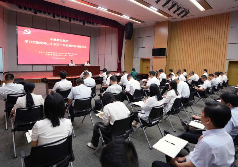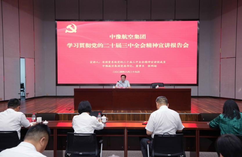 8月29日,按照省委和省政府國資委黨委部署,中豫航空集團舉行學(xué)習(xí)貫徹黨的二十屆三中全會精神宣講報告會。省國資系統(tǒng)宣講團成員,中豫航空集團黨委書記、董事長張明超作宣講報告,黨委副書記、總經(jīng)理、副董事長柳建民主持會議,集團領(lǐng)導(dǎo)班子在鄭成員、中層管理人員、青年員工代表約300人參會。