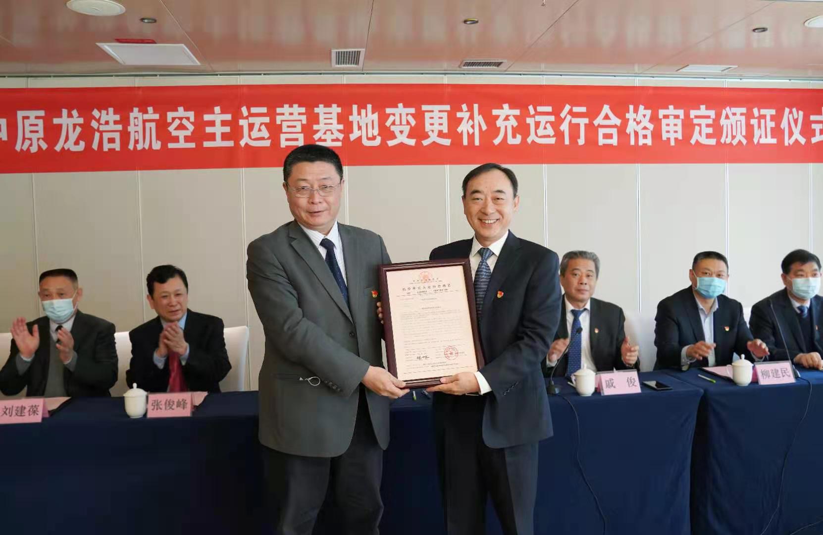 3月4日上午,民航中南地區(qū)管理局局長馬兵在鄭州向中原龍浩航空有限公司頒發(fā)了《航空承運人運行合格證》,這標(biāo)志著中原龍浩的主運營基地由廣州變更至鄭州新鄭國際機場,進入了鄭州廣州“雙基地”協(xié)同聯(lián)動、充分運營的新階段。河南省財政廳黨組成員、副廳長趙慶業(yè)與馬兵共同參加頒證儀式并致辭,民航河南監(jiān)督管理局局長戚俊主持儀式。頒證結(jié)束后,馬兵等參觀了中原龍浩AOC運行控制大廳。