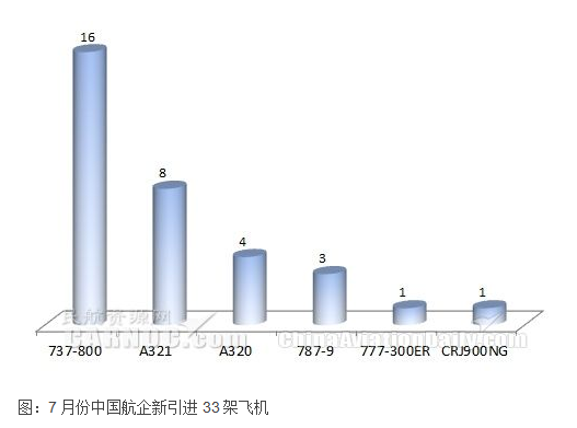 根據(jù)民航數(shù)據(jù)分析系統(tǒng)CADAS,2016年7月份中國大陸航空公司新引進(jìn)飛機(jī)33架。其中南航引進(jìn)飛機(jī)數(shù)量最多,為6架;機(jī)型方面,737-800飛機(jī)數(shù)量最多,為16架。