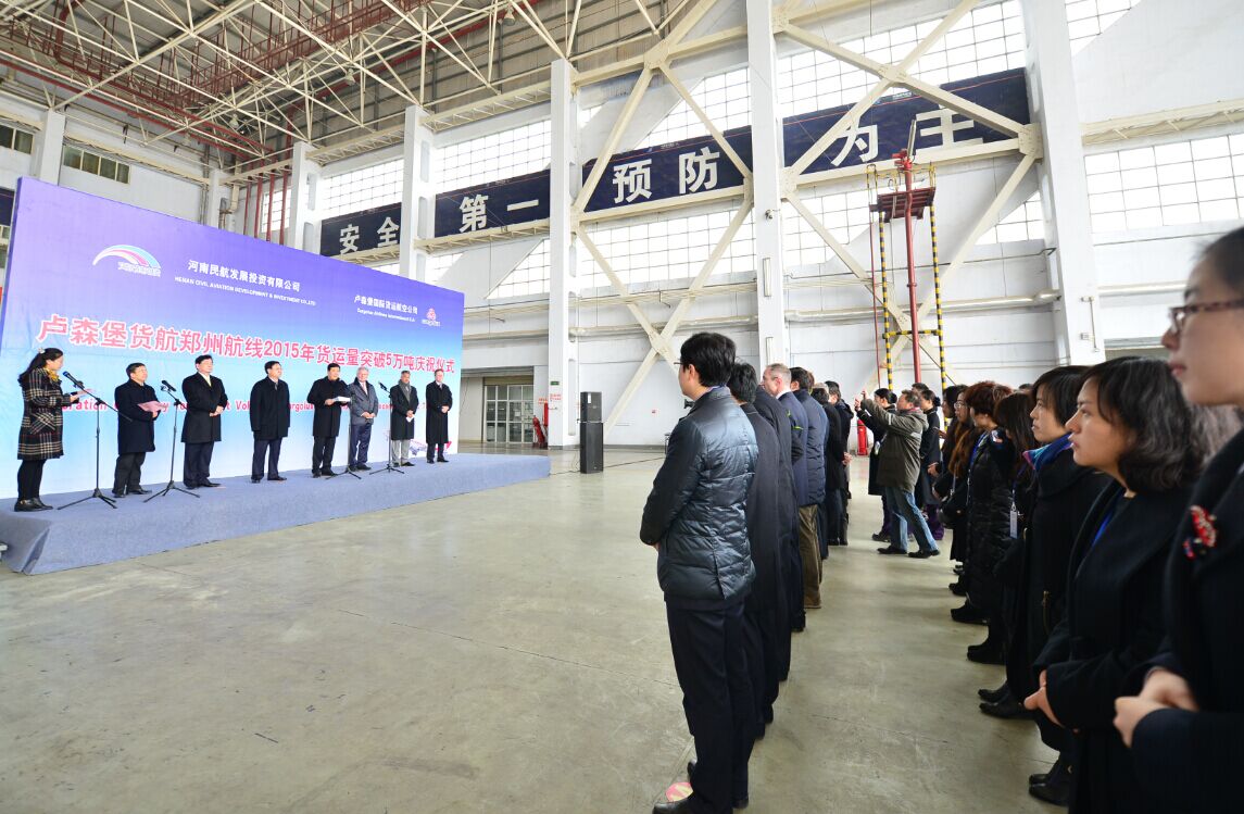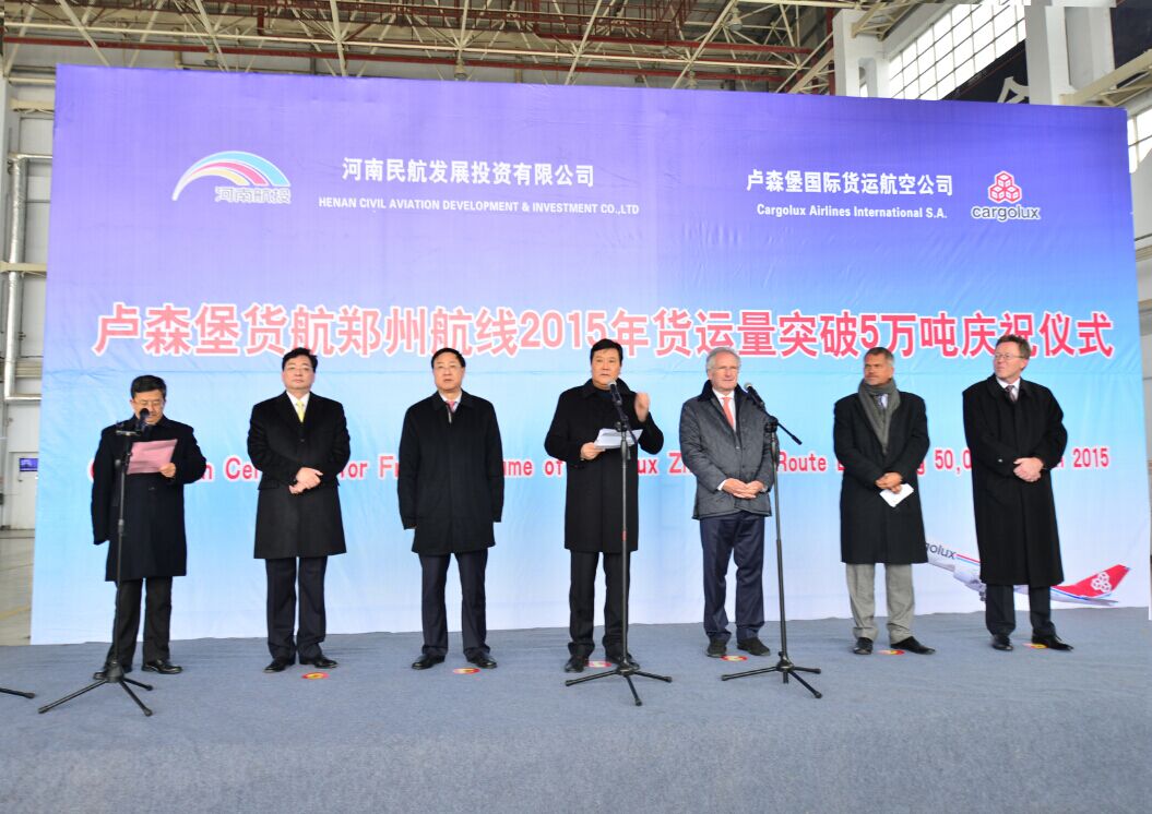 當(dāng)天中午,河南民航發(fā)展投資有限公司與盧貨航聯(lián)合在鄭州機(jī)場(chǎng)舉行了簡(jiǎn)短熱烈的慶祝儀式。河南省副省長(zhǎng)趙建才出席儀式并致辭,盧森堡駐華大使石泰嵋宣讀盧森堡可持續(xù)發(fā)展與基礎(chǔ)產(chǎn)業(yè)部部長(zhǎng)弗朗索瓦?鮑施的賀信,省政府副秘書(shū)長(zhǎng)張雷明主持儀式。省直單位有關(guān)負(fù)責(zé)人親臨現(xiàn)場(chǎng)。河南航投董事長(zhǎng)、黨委書(shū)記張明超,總經(jīng)理、副董事長(zhǎng)、黨委副書(shū)記劉建葆,公司領(lǐng)導(dǎo)悅國(guó)勇、鄭立亮、郭艷紅以及盧貨航董事會(huì)主席保羅?海明格、盧貨航總裁兼CEO德克?李奇同時(shí)參加儀式。